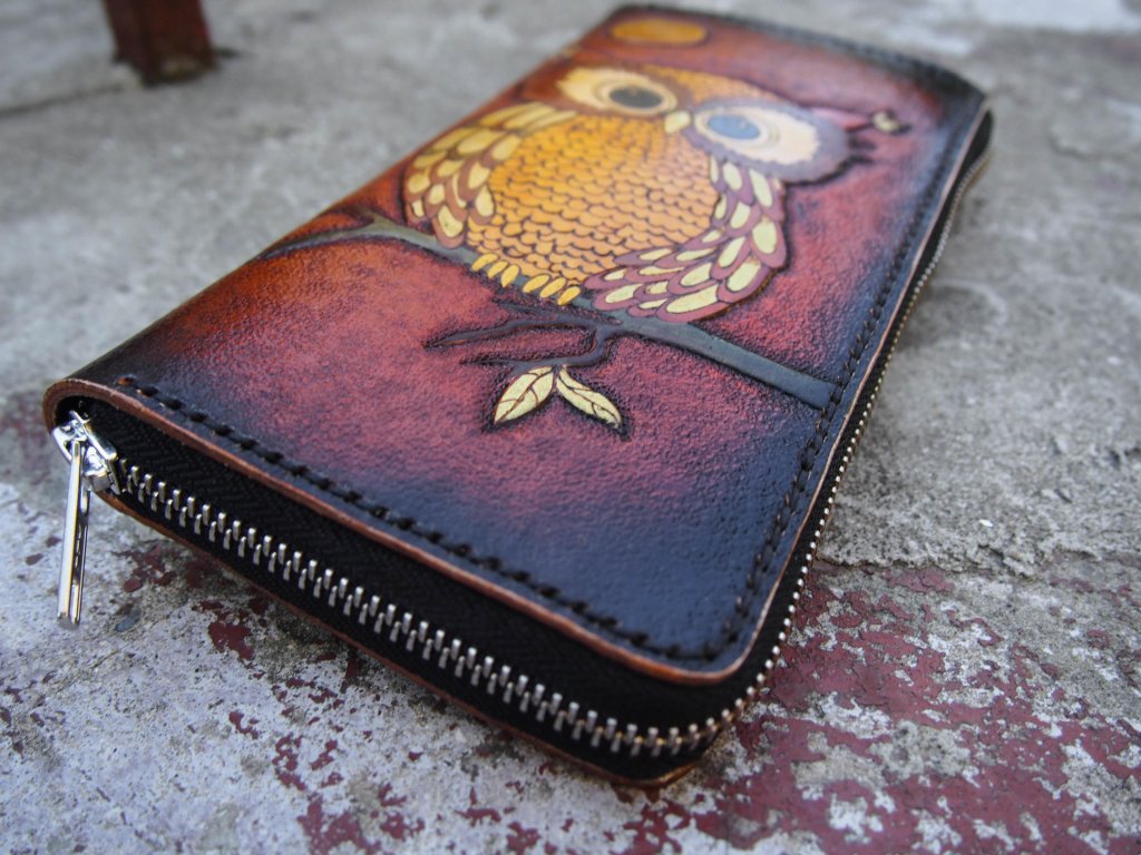 Dámská kožená peněženka na zip – ručně malovaná sova